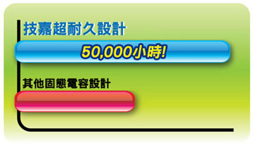 「技嘉第三代超耐久技術」的創新元素除使用2盎斯純銅內層電路板設計外,在固態電容的用料上更堅持只使用日本製造的全日系固態電容(Japanese Lower ESR Solid Capacitor),不但在元件的來源獲得更高的品質保障,更把實際的平均運作週期提升至50,000小時,確保主機板運作品質更穩定、壽命更耐久,消費者買得安心也用得更放心。 |