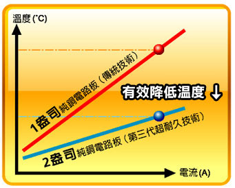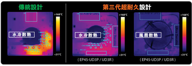 2盎司純銅電路板設計能提供更有效益的散熱解決方案,更高效率地傳導分散主機板區域的熱源,如處理器區域熱源平均分散至整張主機板,實驗數據顯示,「技嘉第三代超耐久主機板」,相較於傳統主機板的運作溫度,可有效的降低溫度。