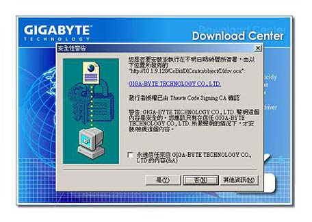 當使用者來到技嘉網站上 Download Center 的介面時即會跳如圖一的數位簽証視窗,使用者必須按下 "是(Y)" 的按鈕後載入技嘉科技下載專區的元件。