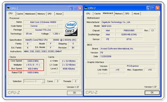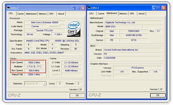 | To give an example, I was able to overclock my DS3 to FSB500 by changing the voltage to my CPU. If you notice below, I increased the voltage from 1.280 v to 1.328 v. | |||||||||||||||||||||||||||