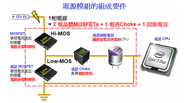 常在接觸DIY的玩家必定聽過主機板上有所謂的三相電源、六相電源等不同規格的電源模組設計,所謂的一相電源主要是由電晶體MOSFET + 電感Choke + 電容三個元件所組成;電晶體MOSFET是負責掌控電流進出的裝置,而電感Choke主要是作為儲能整流的元件,在電流通過時,將過多的電暫存起來,等電能不足時再釋放能量,以達到穩定電流的目的,電容則具備蓄電濾波的功能,確保穩定供電給CPU。 |