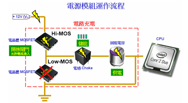 在電路進行充電動作時,Hi-MOS端的電晶體MOSFET會開啟閘門讓電流進入迴路中,而電感Choke此時會進行儲能整流的動作,將過多的電能暫存起來,然後再經過電容的濾波整理後,供電給CPU。 |