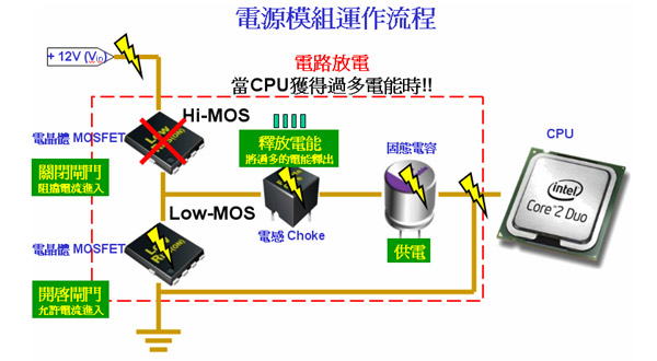 當驅動IC偵測出CPU獲取過多的電能時,會發出訊號通知電源模組進行電路放電動作;首先,位於Hi-MOS端的的電晶體MOSFET會關閉閘門以阻絕電流的進入,再來電感會將之前所儲存的電能釋放出來以保持穩定的電流,而電容則是維持同樣的功能,濾波蓄電並持續供電給CPU;另一方面,過多的電會導通至電路的另一端,Low-MOS的電晶體MOSFET會開啟閘門讓過多的電流重新進入電路中,以降低電能的無謂損耗。 |