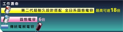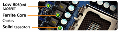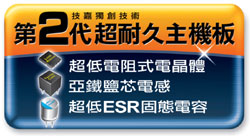 | 技嘉第二代超耐久主要是由低電阻式電晶體(Low RDS(on) MOSFET)、亞鐵鹽芯電感(Ferrite core chokes)及全日系固態電容三個要件所組成,透過此高階、高品質的電子元件,讓電源模組在充放電的運作上更具效率,進而帶給系統更穩定、更低溫、更耐久及更強大的超頻能力。 | |||||||||||