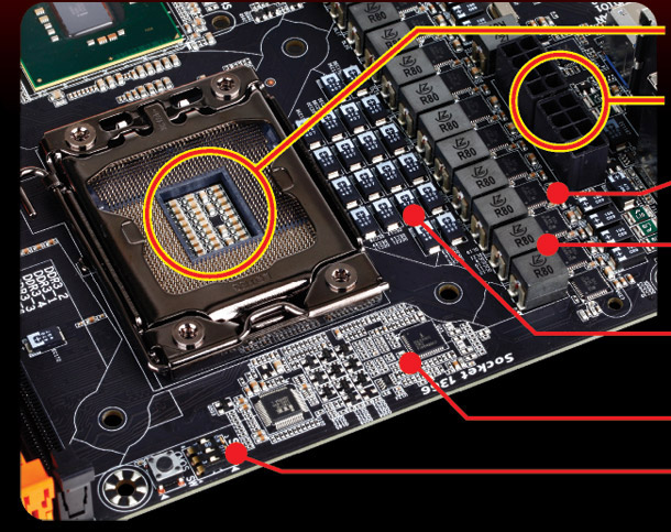 Le produit GIGABYTE X58A-OC introduit d'excitantes et uniques technologies d'overclocking telles que le switch de fréquence PWM, un panel de boutons d'OC, des connecteurs SATA pour le support des configurations multi-graphiques, ainsi qu'un switch DualBIOS™. Technologies de tweaking mises à part, nous avons décidé d'employer des composants ultra-qualitatifs tels que POScaps et bobines MPFC ( Max Power Ferrite Core ) permettant d'offrir à chaque overclocker une plus grande stabilité lors de la gestion de courants électriques importants. |