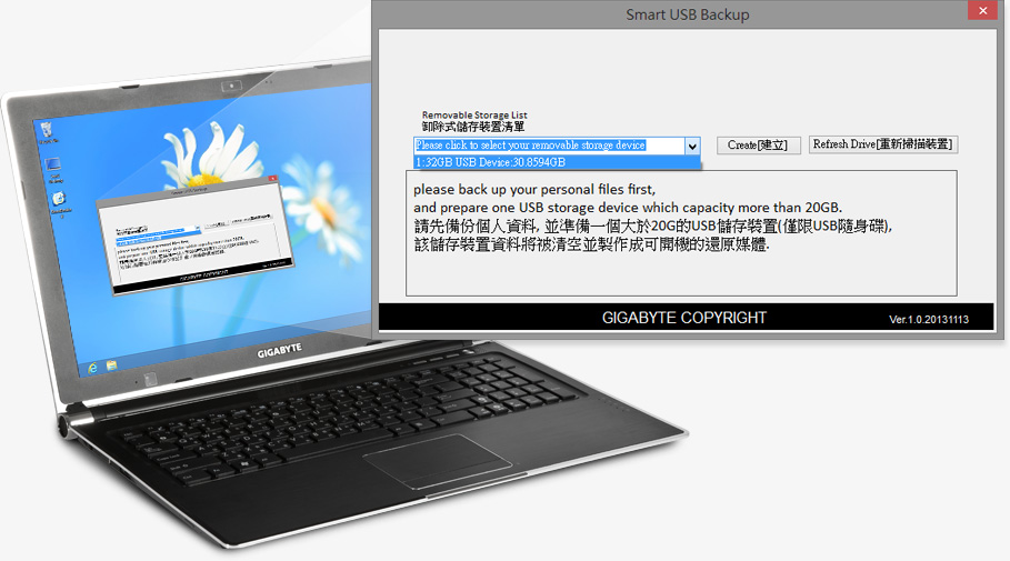 Aside from Smart Recovery, Smart USB Backup offers an easy alternative way for system recovery. Windows 8 Recovery Utilities is immediately available after boot-up. Simply plug in an empty flash drive and follow the instructions, rapid transmission through USB 3.0 make it quick for default system restoration*.