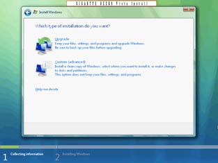 This screen asks if you are doing a Upgrade install or Custom install. If you select Custom install, please note that all your old files, settings and programs will not be saved. As I am doing a new install, I will select the Custom button.