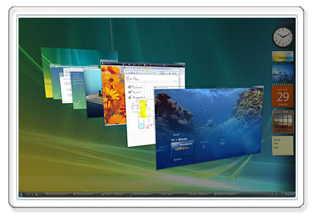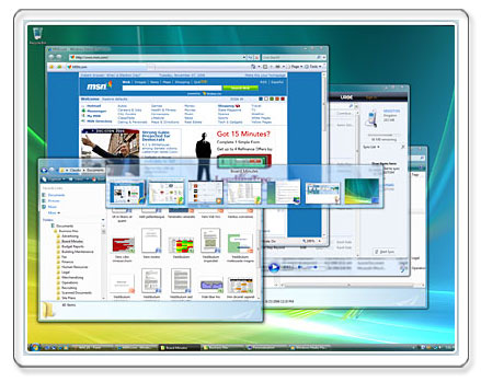 | Most everyone has heard of Windows Aero. On first impression, Aero is the biggest change at least visually between Vista and XP. Aero is also one of the main reasons why the graphics hardware requirement for Vista is so much higher. Besides just being neat to look at, Windows Aero has 2 key features that make navigating quicker, easier and more fun. The first is Windows Flip and can be accessed using ALT+TAB. | |||||||||||
