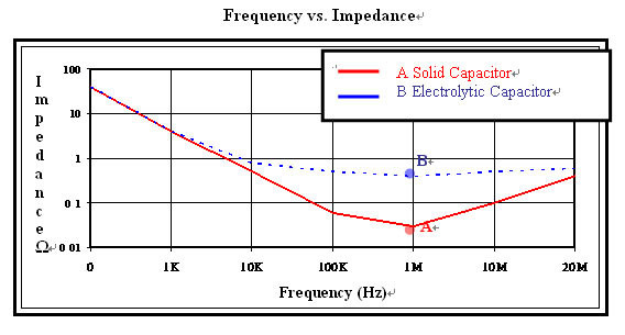 First, let's try to understand the higher tolerance for high frequencies. In order to do this, we must first understand a little bit about Impedance. Impedance is a measure of the overall opposition of a circuit to current and is measured in ohms (Ω). A better way to phrase this might be to say that impedance is how much the circuit (in this case the capacitor) impedes the flow of current. The less the flow of current is impeded, the better. Less impedance also means less heat is generated. |