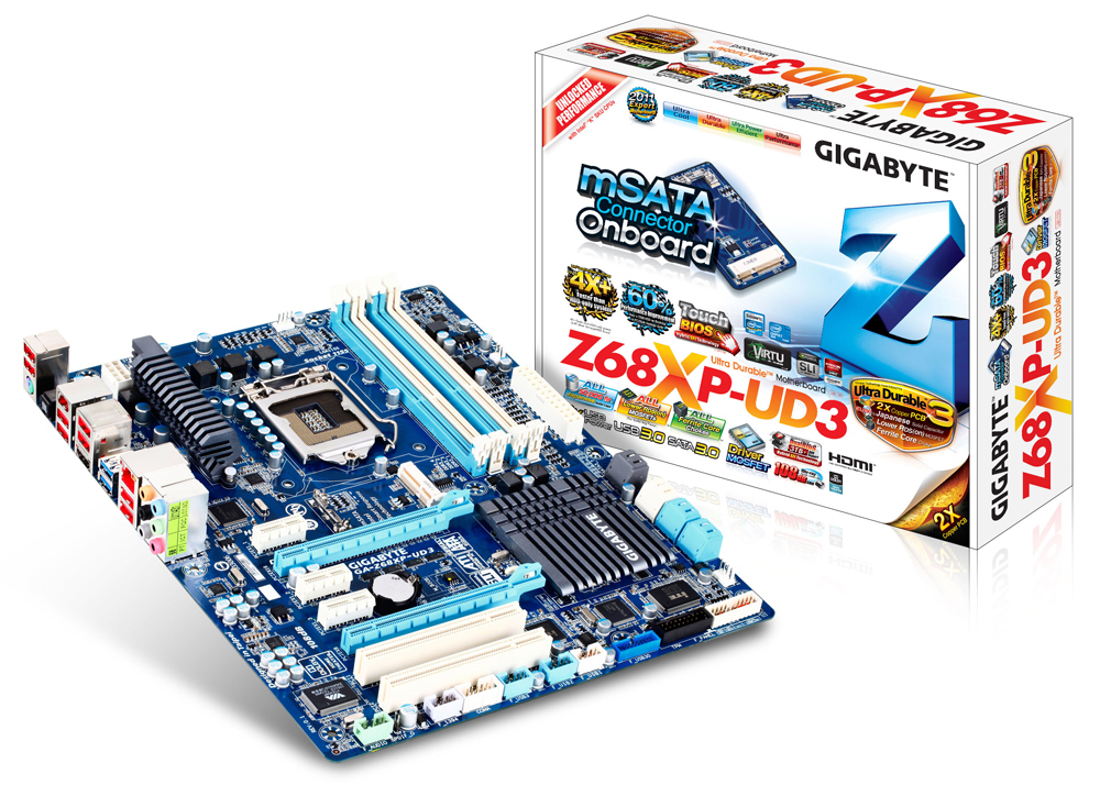 The GA-Z68XP-UD3 motherboard, based on the Intel® Z68 Express Chipset and supporting the new 2nd generation Intel® Core™ processors. Delivering the very best that Intel® 6 series chipsets have to offer, including a significant performance boost with Intel® Smart Response Technology, the first ever mSATA drive connectors on a standard desktop PC motherboard, and GIGABYTE's proprietary Touch BIOS™ technology, GIGABYTE Z68 series motherboards put users in the driver seat, allowing them to take total control over how their system operates and performs to best match their individual computing needs.
