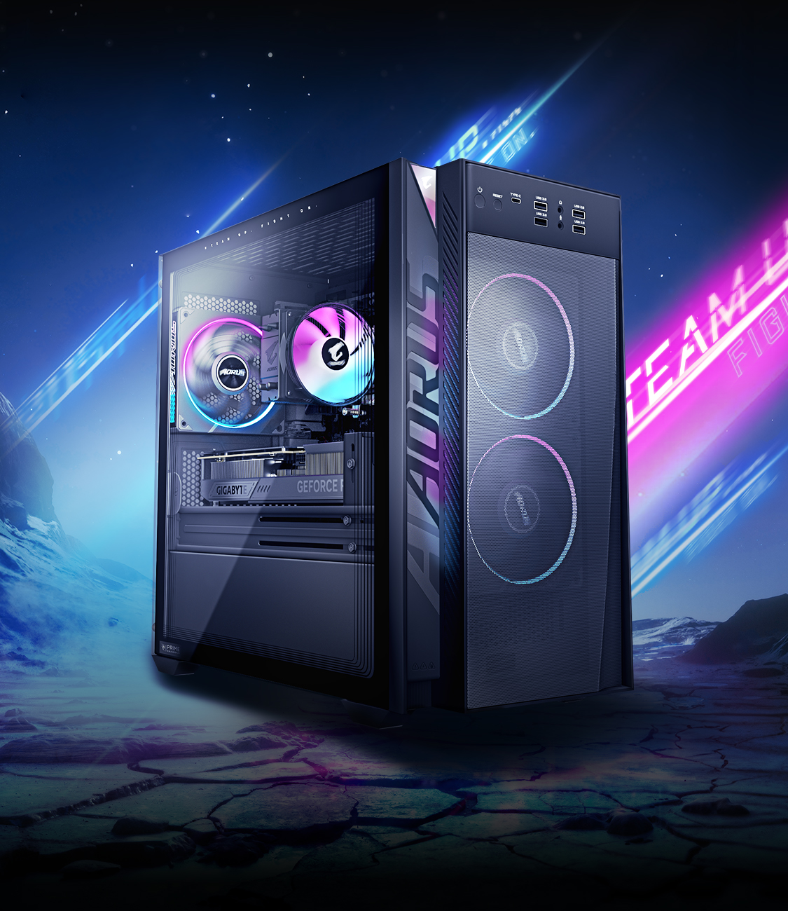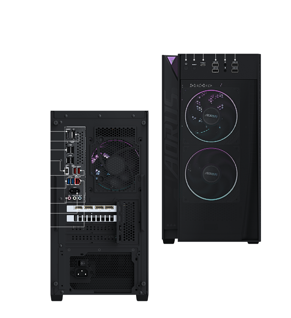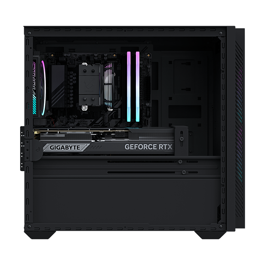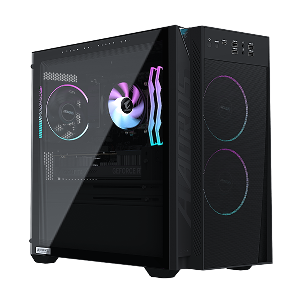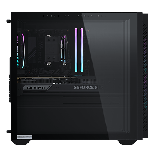 AORUS PRIME 3 展現獨具特色的 AORUS 電競風格,結合俐落線條、大膽的 RGB 燈效與強化玻璃側透,讓整體遊戲配置更上一層樓。