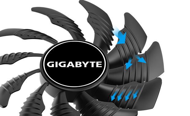 技嘉風之力散熱系統搭載2個獨特刀鋒導流造型風扇,搭配正逆轉功能、以及風扇停轉功能等散熱技術,可大幅提升解熱能力。