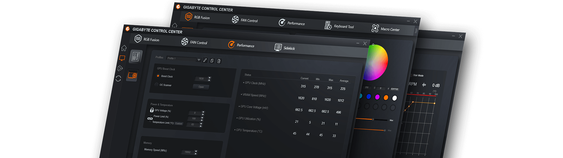 全新的GIGABYTE CONTROL CENTER (GCC) 應用程式整合了技嘉所有產品。透過全新直覺式的介面,玩家可輕鬆調校核心時脈、電壓大小、風扇運作模式以及供電大小等,立即調校到最佳效能運用。
