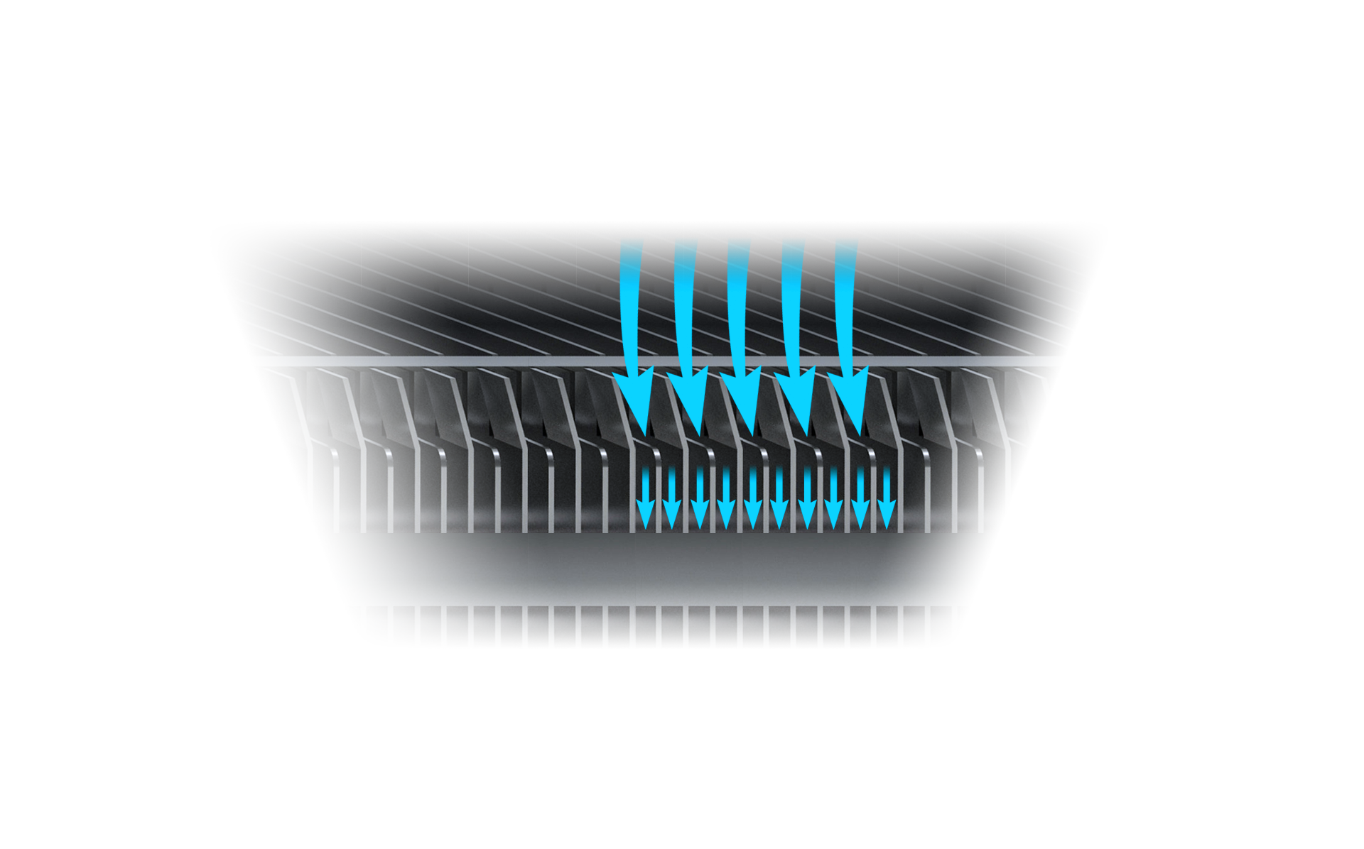 彎角造型與高低鰭片的設計,可以順著風的方向將風流完全導引到鰭片內,最佳化散熱面積並減少風切聲,提升散熱效率。