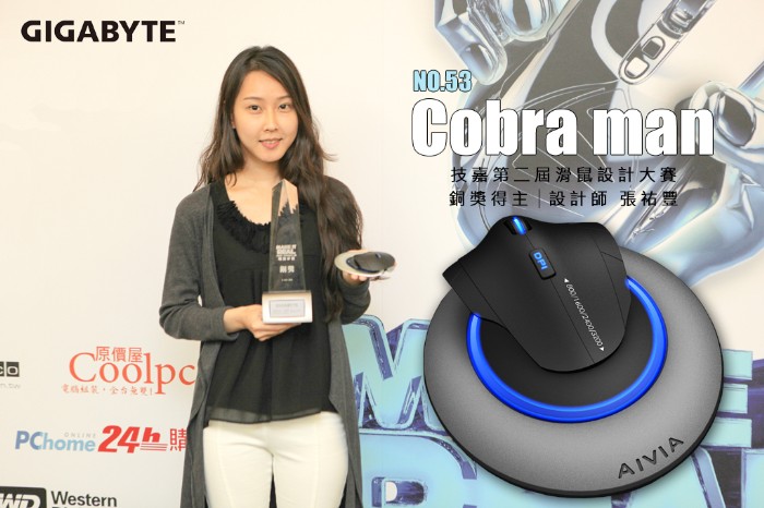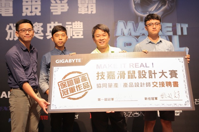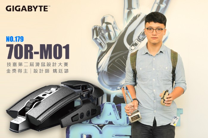 2014年7月10日,台灣,台北 – 近年來屢獲多項國際產品設計大獎的周邊配備大廠技嘉科技,於今年3月起舉辦「Make It Real! 技嘉第二屆滑鼠設計大賽《電競爭霸》」,就在7月8日進入最終決賽,並立馬於下午進行頒獎典禮。此次大獎由新銳設計師姚廷諺所設計的作品「70R-M01」榮獲,此作品以來福槍為設計概念,濃烈的軍事遊戲風格,獲得評審一致青睞,不僅帶走新台幣15萬元的獎金,技嘉科技更再次「保證量產」此冠軍作品,並協助行銷全世界。銀獎為張俊杰黃昭凱雙人組所設計的作品「Double Transfer」獲得,主打可隨時因應不同手感需求而調整的滑鼠設計,受到評審的喜愛;銅獎則由張祐豐所設計的「Cobra Man」奪得,以考量散熱與手感的材質應用,獲得評審的好評。