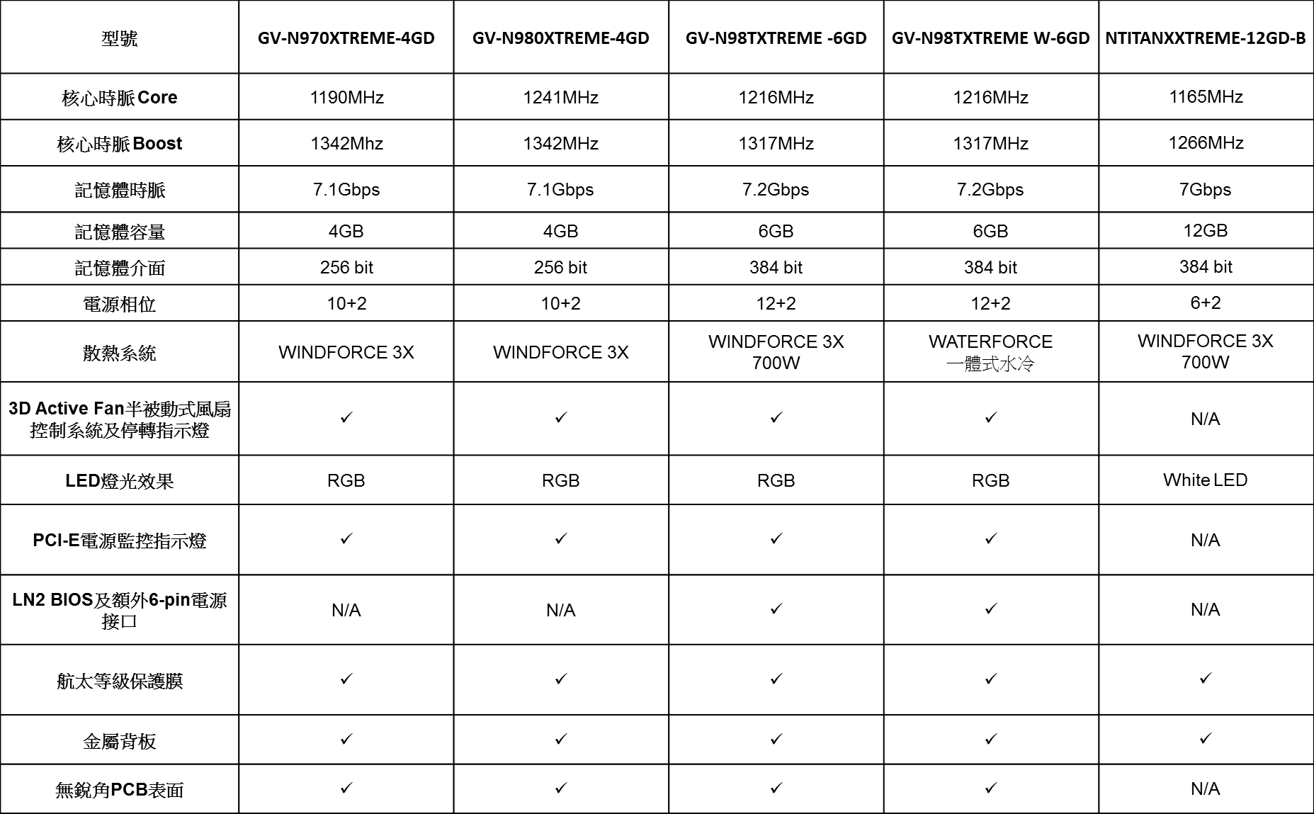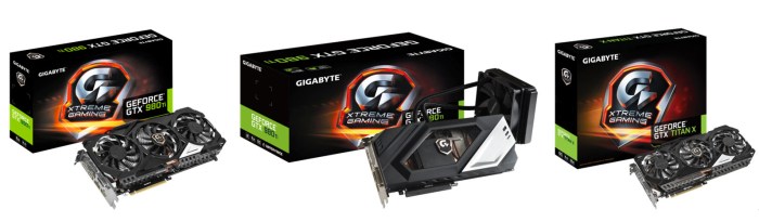 技嘉科技此次同時發表TITAN X (GV-NTITANXXTREME-12GD-B) 、 GTX 980 Ti WINDFORCE風之力(GV-N98TXTREME-6GD)與WATERFORCE水之力 (GV-N98TXTREME W-6GD) 兩種版本、GTX 980 (GV-N980XTREME-4GD)以及GTX 970 (GV-N970XTREME-4GD) 等五款XTREME GAMING系列顯示卡。從狂熱玩家的需求為出發點,並以頂級電競精品為主要訴求,將顯示卡從裡到外重新設計優化,為不斷超越自我極限的玩家們,提供最極致剽悍的遊戲利器。