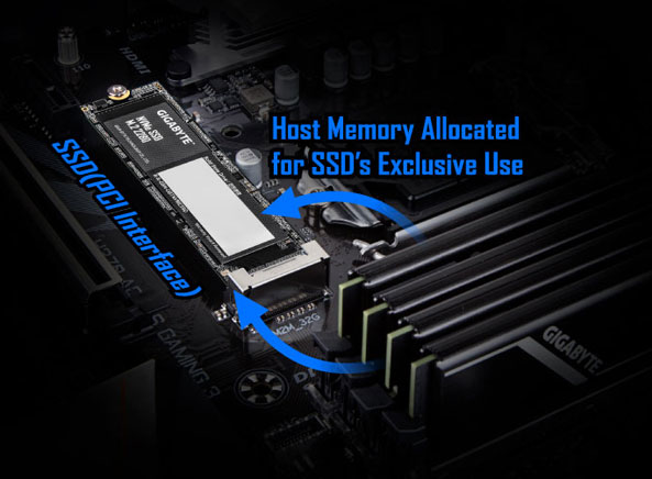 主機記憶體緩衝技術(HMB, Host Memory Buffer) 利用PCIe介面的直接記憶體存取技術(Direct Memory Access,DMA),讓固態硬碟使用電腦主機上的實體記憶體做為快取,提高固態硬碟的讀取/寫入效能。