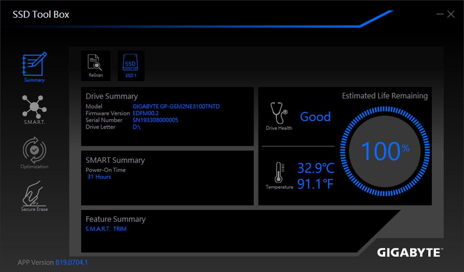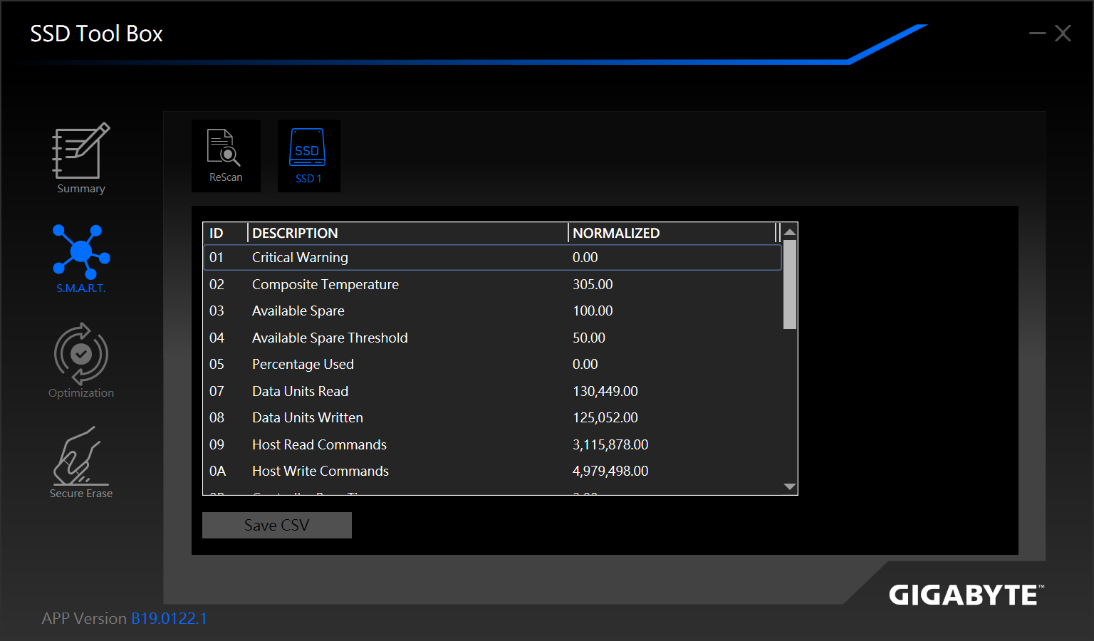GIGABYTE SSD Toolbox應用程式,可以讓使用者監控和管理技嘉固態硬碟的各項數據,讓玩家可以隨時掌握固態硬碟的使用狀態及相關安全係數。