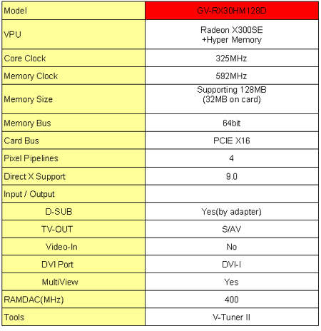 2005/05/11 Taipei, Taiwan-- GIGABYTE TECHNOLOGY Co. Ltd., today released the GV-RX30HM128D, its first ATI RADEONTM X300SE HyperMemory™ PCI-E graphics card designed for powerful entry level PC systems. The GV-RX30HM128D gets a huge performance boost from HyperMemory™ technology that enables both onboard memory and system memory to be used for graphics intensive applications, and ideally positions it as an affordable upgrade for users who want to make the move to PCI-Express graphics. Together with full PCI Express bus support, HyperMemory™ technology enables the GV-RX30HM128D to efficiently handle demanding tasks such as digital photo/video editing and PC gaming, as well as normal entertainment and productivity applications such as watching DVDs, surfing the web and manipulating spreadsheets. Additionally, the ATI RADEON® X300 series of GPU offers unequalled value for money while delivering outstanding reliability, speed and graphics computing power. Performance Features The GIGABYTE GV-RX30HM128D supports all latest 3D rendering technologies and boasts excellent 3D gaming performance. Outstanding performance features include: