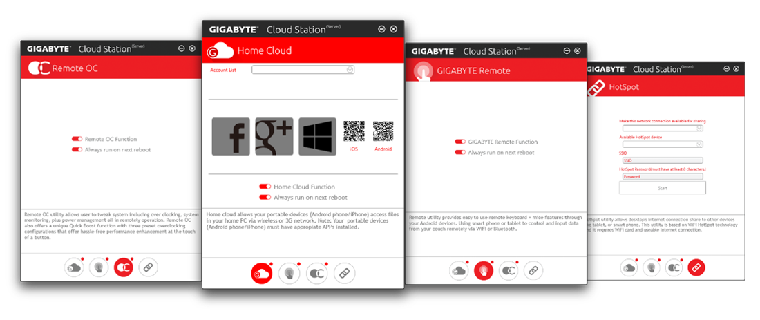 GIGABYTE Cloud Station™ is composed of several GIGABYTE unique apps that allow your smart phones/tablet devices to communicate, share resources, and control your desktop PC via a wireless connection.