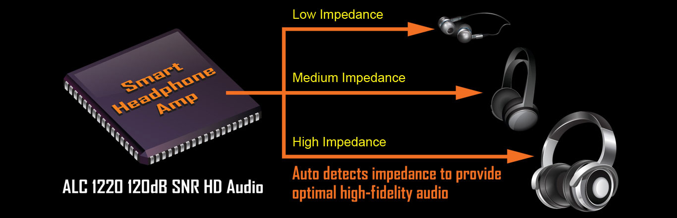 The ALC1220 is a high-performance multi-channel High Definition Audio Codec with up to 120dB SNR for crystal clear audio and features such as Smart Headphone Amp, 108dB SNR recording for precise voice chats and hardware decoding of DSD128, ensuring users get the best possible audio quality from their PC.