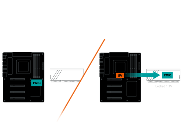 MB provides fixed 5V to Native DDR5 memory and built-in PMIC outputs locked 1.1v to memory IC.