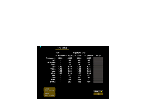 Define and create your own SPD profile into Native, AMD EXPO™ and Intel® XMP 3.0 memory modules. One user-defined profile can be saved, loaded either locally or from/to an external storage device.