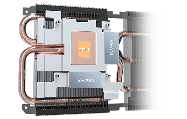 The copper plate directly contacts the GPU, coupled with the composite copper heat pipes, which quickly transfers the heat of the GPU and VRAM to the heatsink.