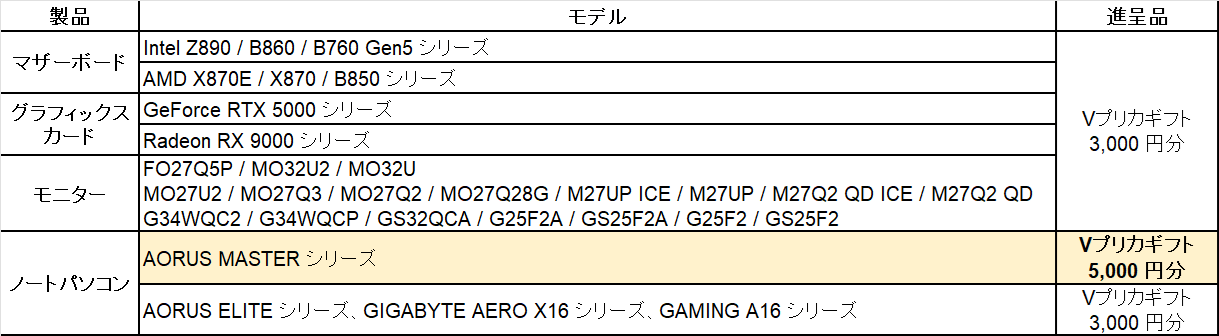 高品質マザーボード及び、グラフィックスカード等のハードウェア製品メーカーである GIGABYTE Technology Co., Ltd. は、2025年8月1日(金)から2026年1月31日(土)までの期間で、対象製品をご購入してレビューを投稿すると、最大 5,000 円分の V プリカが貰える「2025年全製品レビューキャンペーン」を開催いたします。