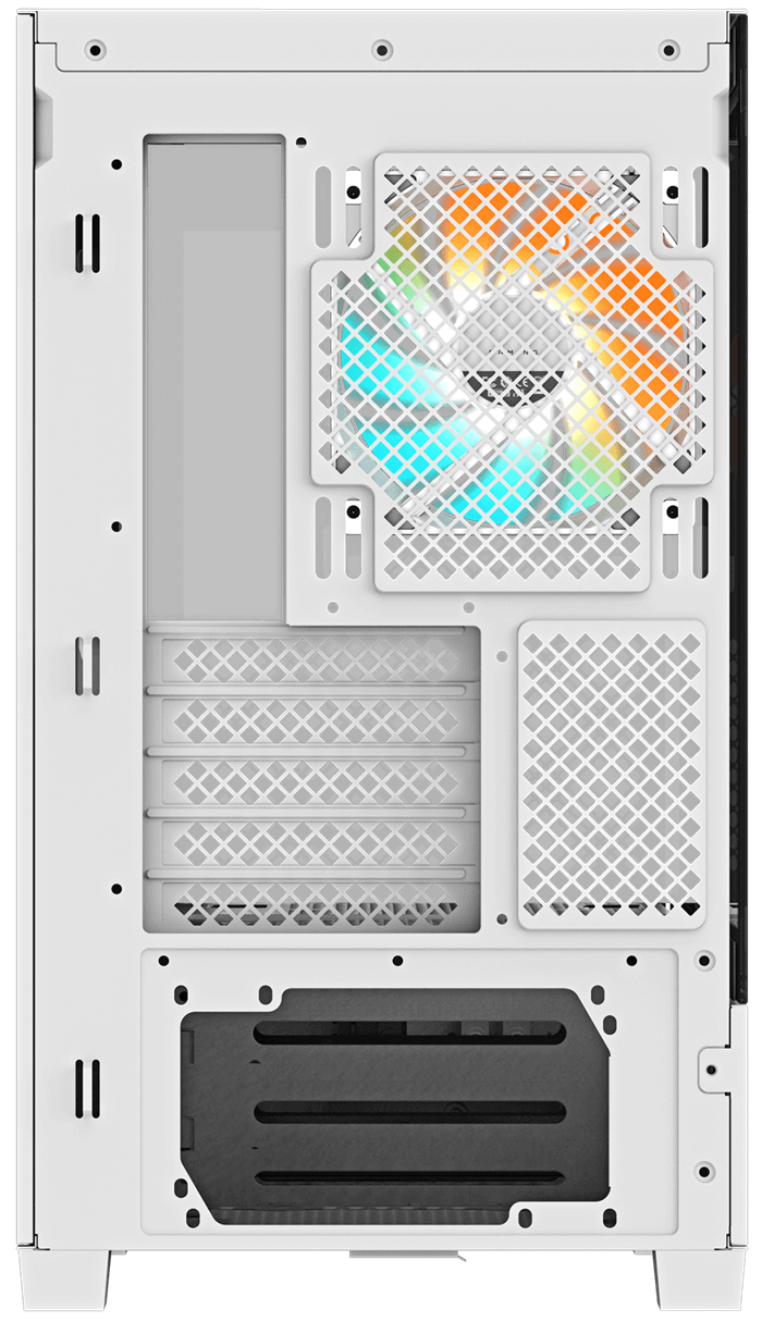 ※ MicroATX / Mini-ITX 規格のマザーボードに対応する白色ミドルタワー型ケースです。前面と側面を 3mm 厚のスモーク加工強化ガラスパネルとした、いわゆるピラーレス設計で、PC 内部を広く見せることができます。ガラスパネルは穴あけ加工などがなく、損傷のリスクが軽減されています。標準で 120mm ARGB ファンを3基搭載します。RGB ライティングはケースだけでも13種類の発光エフェクトを利用できますが、マザーボードと接続することでソフトウェア制御にも対応します。拡張性に関しては、410mm 長の拡張カード、190mm の高さのクーラー、最大 360mm クラスのラジエーターの天井部への搭載に対応します。ドライブベイは 2.5 インチ1つ、2.5 / 3.5 インチ2つを用意しています。天井部、側面には磁石設置の、底面にはスライド式の防塵フィルターを搭載しており、清掃も容易です。I/O ポートは USB 3.0を2つ搭載します。
