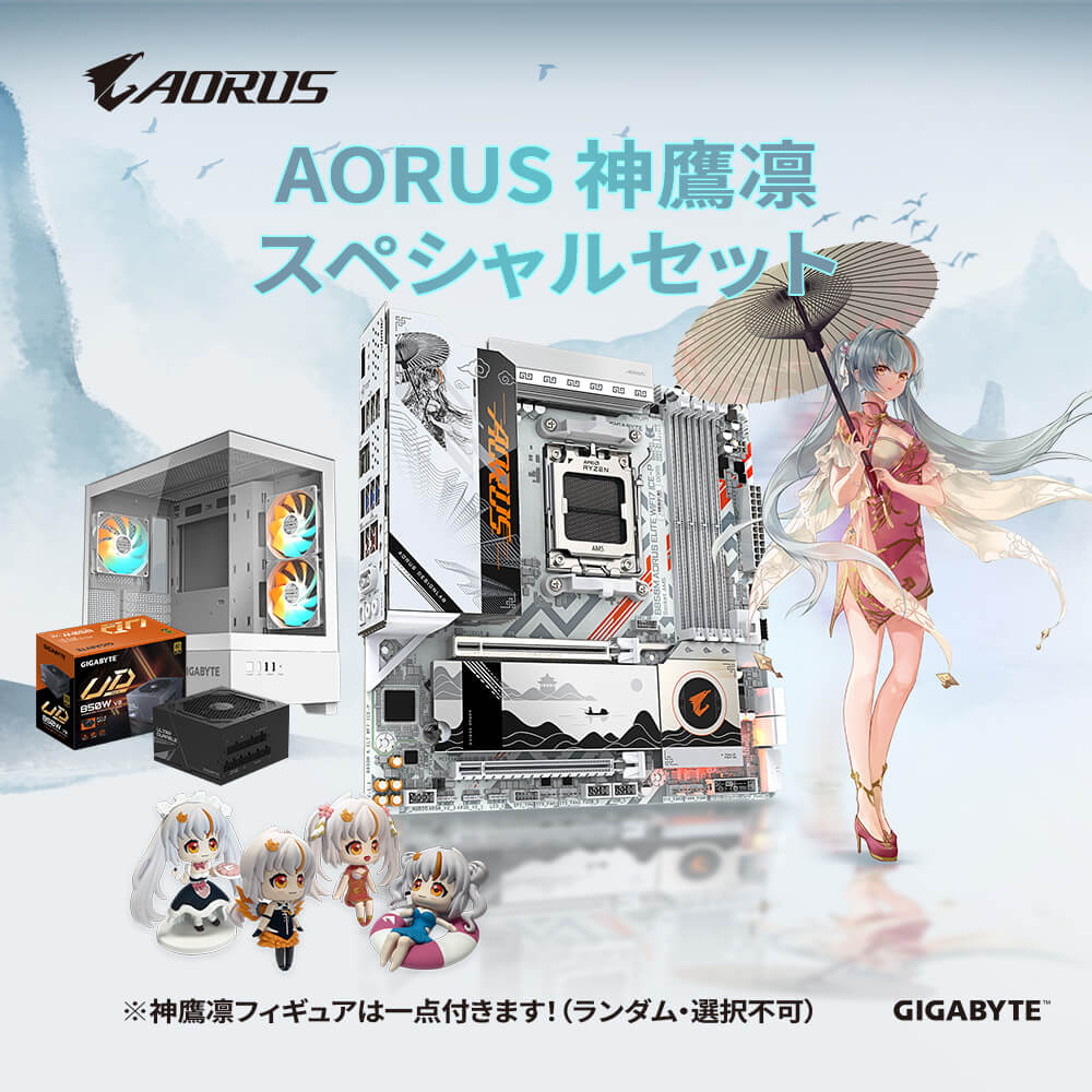 AORUS 神鷹凛マザーボード製品と PC ケース、電源ユニット、神鷹凛フィギュアからなるお得な4点セットを、