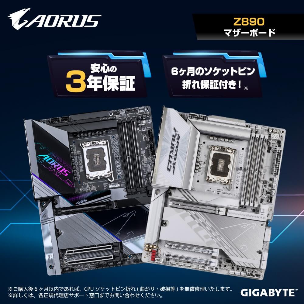 Intel Z890 チップセット・マザーボード製品も3年製品保証および、ご購入後6ヶ月 CPU ソケットピン折れ (曲がり・破損等) 無償修理保証対象です。