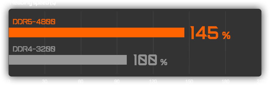 AORUS 게이밍 노트북은 최신 DDR5-4800 메모리를 지원합니다. DDR4-3200보다 45% 빠른 읽기 속도로 멀티태스킹이나 치열한 게임 배틀에서도 안정적인 출력을 즐기세요.
