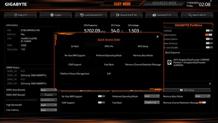 GIGABYTE UC BIOS' Quick Access function selects 9 practical preset options from ADVANCE MODE and places them in EASY MODE for effortless access without switching or searching.