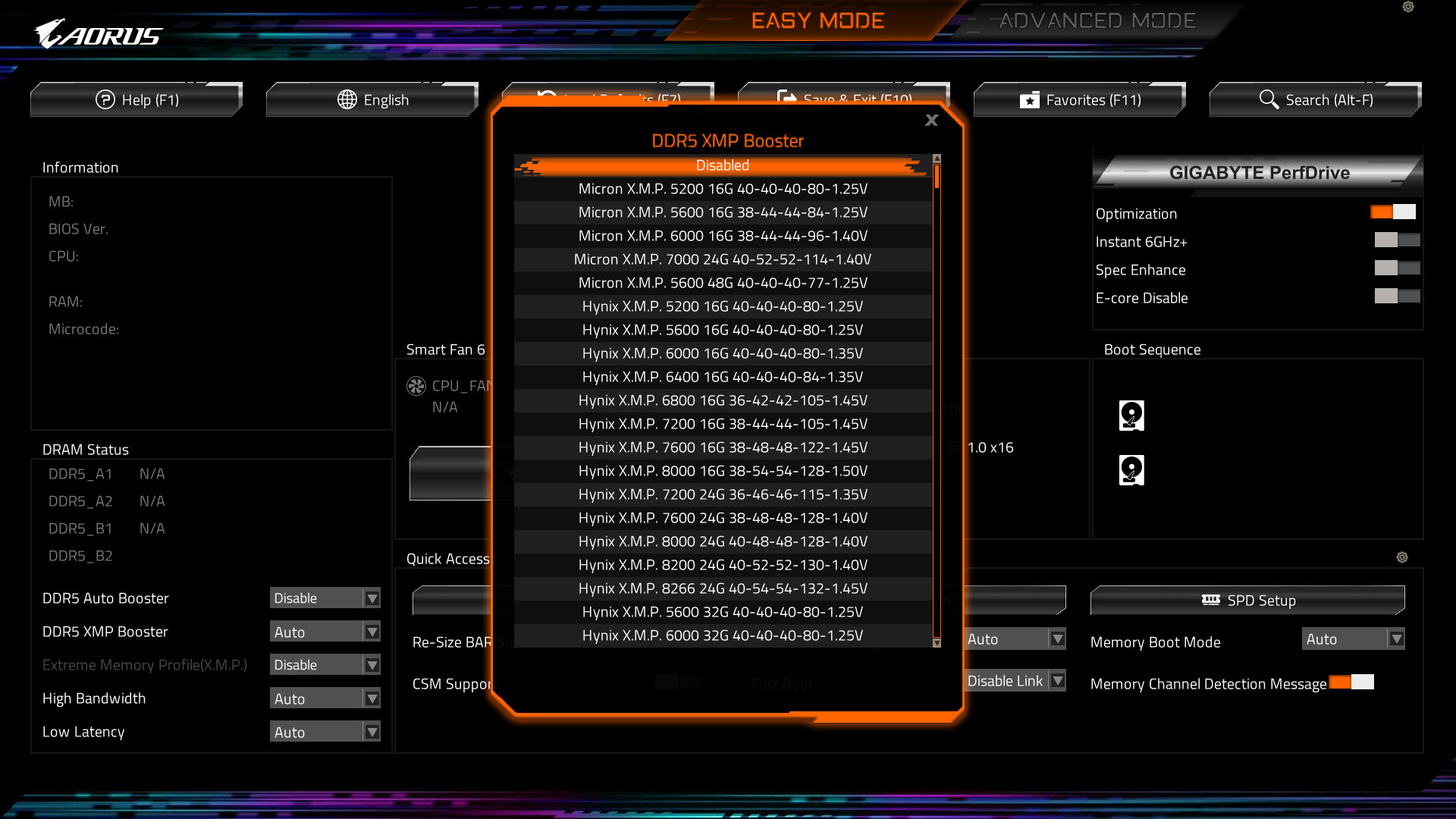 DDR5 XMP Booster function provides optimized pre-defined profiles, based on memory IC and PMIC vendor analysis, for effortless performance enhancement and elimination of manual configuration for overclocked DDR5 memory kits.