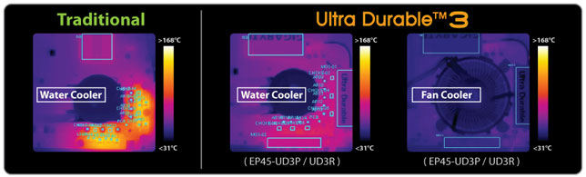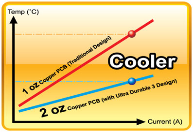 Temperature Doubling the amount of copper provides a more effective thermal cooling solution by delivering a more efficient spreading of heat from critical areas of the motherboard such as the CPU power zone throughout the entire PCB. In fact, GIGABYTE Ultra Durable 3 motherboards are able to deliver twice as cool working temperatures than traditional motherboards.
