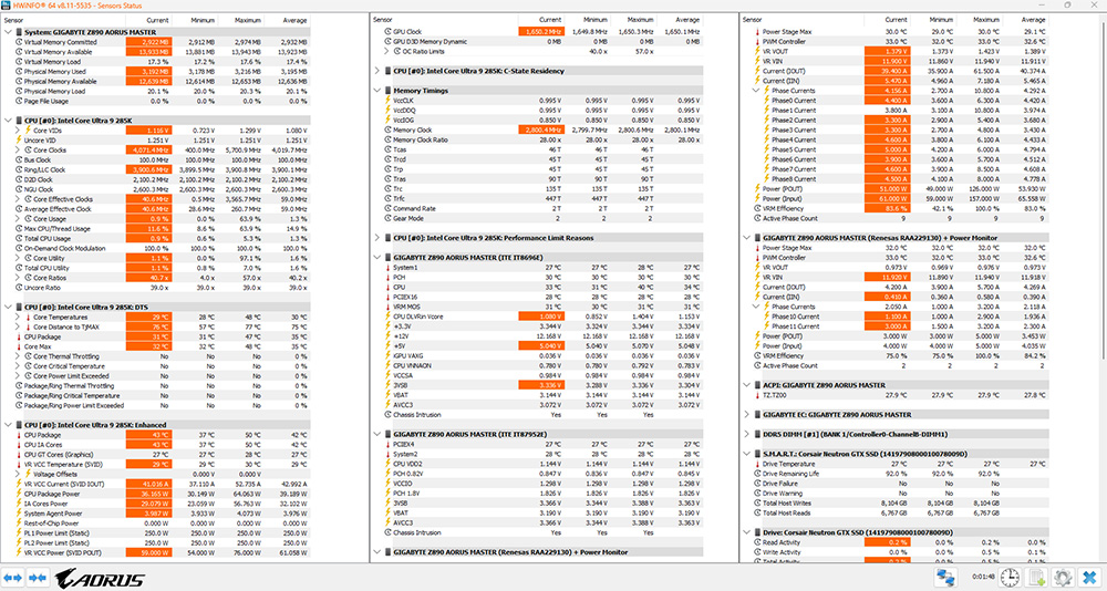 When using HWiNFO on a GIGABYTE motherboard, a custom AORUS-themed interface automatically activates, offering light and dark options. This AORUS Skin can be manually applied to non-GIGABYTE boards as well.