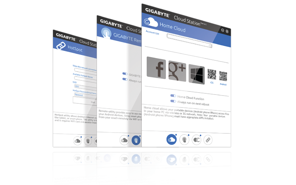 GIGABYTE™ Cloud Station™ is composed of several GIGABYTE unique apps that allow your smart phones/tablet devices to communicate, share resources, and control your desktop PC via a wireless connection.