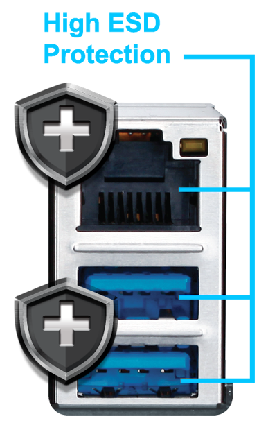 GIGABYTE motherboards raise the bar in terms of protecting your system, providing advanced electrostatic discharge (ESD) protection for both your Ethernet LAN and USB ports, both common sources of ESD-related failures. Each LAN and USB port is paired with a dedicated protection filter that can withstand high electrostatic discharges, protecting your system from common electrical surges and even direct lighting strikes.