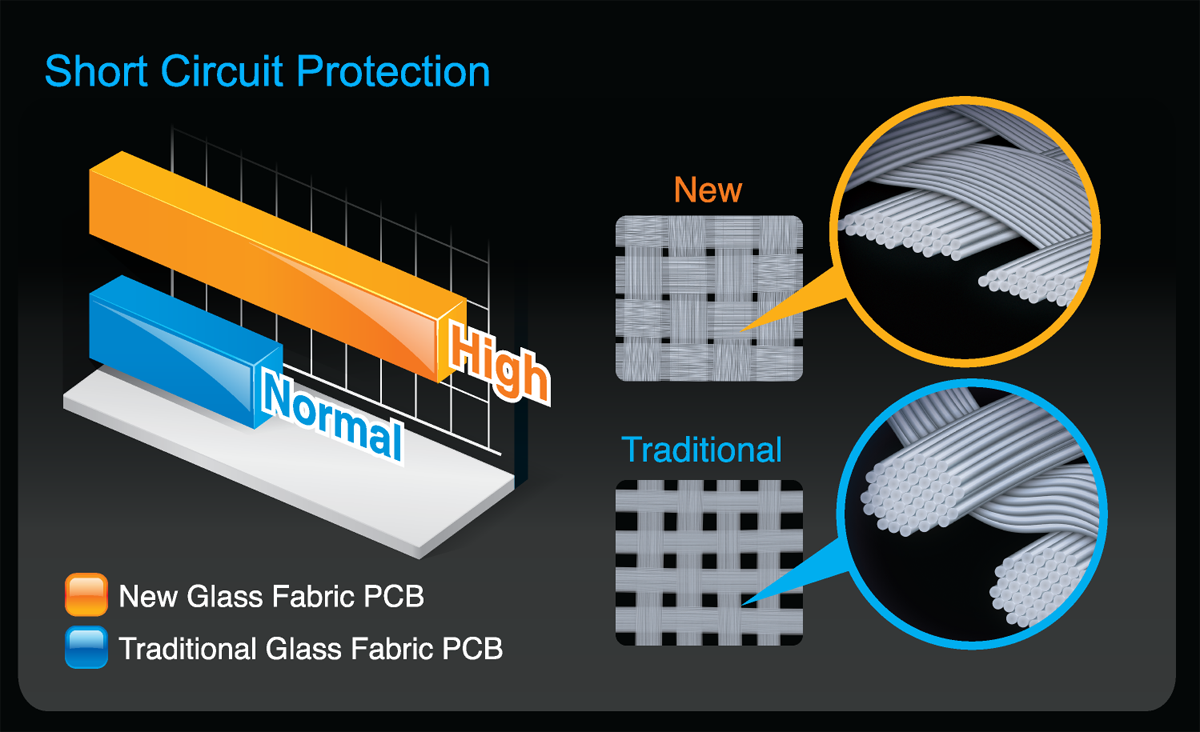 Glass Fabric PCB technology uses a new PCB material which reduces the amount of space between the fiber weave, making it much more difficult for moisture to penetrate compared to traditional motherboard PCBs. This offers much better protection from short circuit and system malfunction caused by humid and damp conditions.
