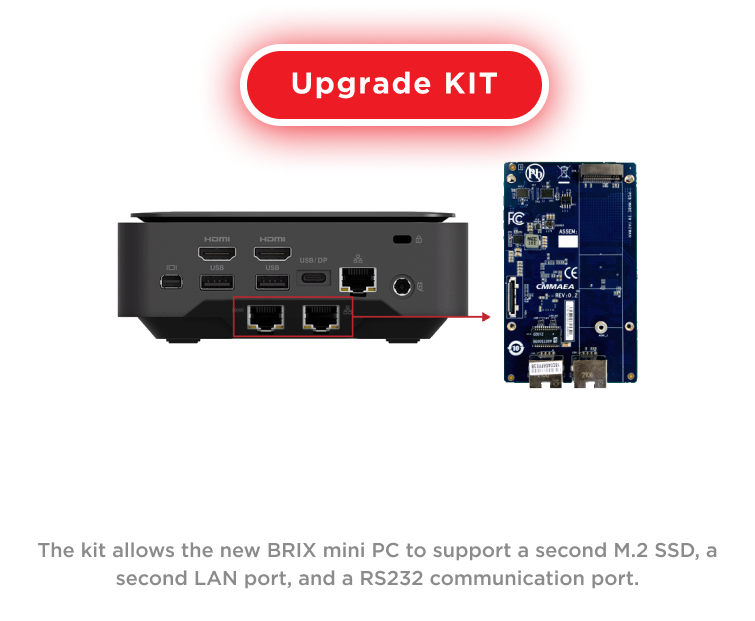 The all-new 2023 BRIX offers two paths for upgrading either storage and/or networking. The storage capacity can increase with an additional M.2 SSD. Additionally, the kit can add to the networking capabilities with a second LAN port and a new RS232 port.
