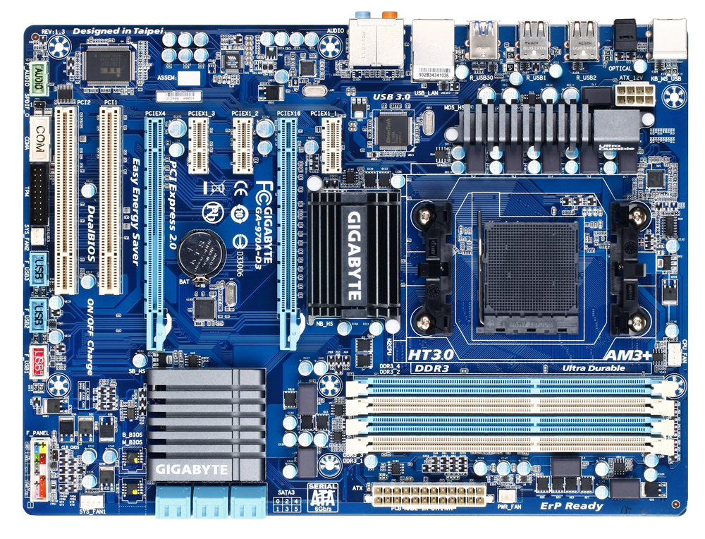 مادربرد 970A-D3 به گونه ای طراحی شده است که پیکره بندی پایدار و پر سرعتی را ارائه می دهد و توانایی انتقال داده ها با سرعت بسیار بالایی را دارد و این ویژگی ها به واسطه فن آوری شتاب دهنده آنبرد 333 گیگابایت به دست آمده اند. با وجود اولین کنترل کننده هاست USB 3.0، مادربردهای سری AMD 900 به کاربران این امکان را می دهند که با سرعت 5Gbps اطلاعات را جابجا کنند و از مزیت 10 برابر سرعت بیشتر نسبت به درگاه های USB 2.0 نسل قبل بهره مند شوند. با استفاده از اولین رابط Serial ATA 3.0 با چیپ ست SB950، مادربردهای سری AMD 900 گیگابایت ارائه دهنده 6 درگاه ذاتی از رابط های نسل جدید هستند و توانایی انتقال داده ها با سرعت بسیار بالای 6Gbps را دارند. این رابط ها از حالت های RAID 0, 1, 5, 10 نیز پشتیبانی می کنند. در ساخت مادربردهای سری AMD 900 از فیوزهای با مقاومت پایینی استفاده شده است که طراحی سخت افزاری منحصر به فردی دارند. به این ترتیب افت ولتاژ بسیار کم خواهد بود و پایداری سیستم بسیار بالا خواهد رفت. همچنین درگاه های USB مجهز به ویژگی 3x Power هستند که توان بیشتری را در اختیار ابزارهای USB پرمصرف قرار می دهند.