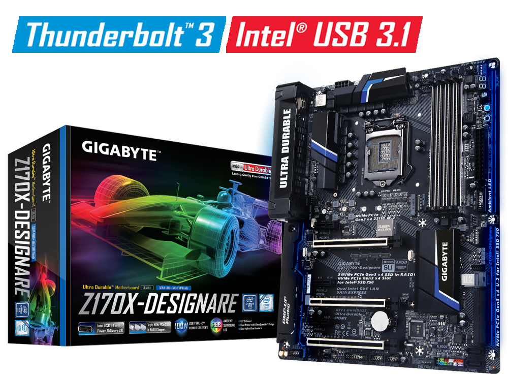 Powered by Intel's own Thunderbolt controller the new Thunderbolt™ 3 protocol, which is available over a USB Type-C™ connector on the back I/O of the GIGABYTE Z170X-Designare, brings an unprecedented single-wire bandwidth of up to 40 Gb/s -- twice more than the previous generation of Thunderbolt! This incredible increase in bandwidth is also accompanied with support for different protocols such as DisplayPort 1.2 and USB 3.1, which is backwards compatible with USB 3.0 and USB 2.0, opening up a world of new possibilities.