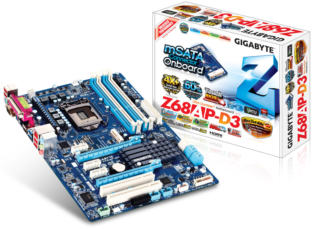 The GA-Z68AP-D3 motherboard, based on the Intel® Z68 Express Chipset and supporting the new 2nd generation Intel® Core™ processors. Delivering the very best that Intel® 6 series chipsets have to offer, including a significant performance boost with Intel® Smart Response Technology, the first ever mSATA drive connectors on a standard desktop PC motherboard, and GIGABYTE's proprietary Touch BIOS™ technology, GIGABYTE Z68 series motherboards put users in the driver seat, allowing them to take total control over how their system operates and performs to best match their individual computing needs.