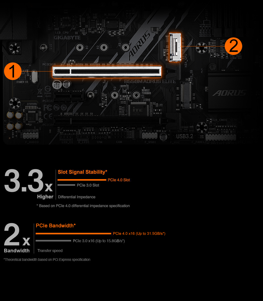 PCIe 4.0 x16 slot with faster bandwidth and lower impedance.