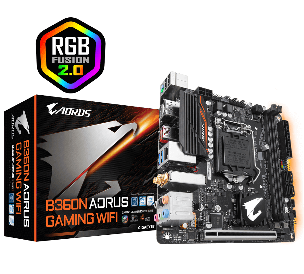 Intel B360 AORUS motherboard with Intel CNVi WIFI ready, Intel GbE LAN with cFosSpeed, RGB Fusion 2.0 with Digital LEDs, Ultra Durable PCIe Armor, Native Intel USB 3.1 Gen2 Type-A, USB3.1 Gen1 Type-C, Anti-Sulfur Resistor, Smart Fan5, DualBIOS™, CEC 2019 ready