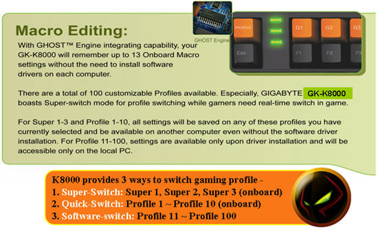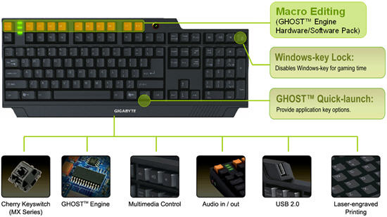 GIGABYTE GK-K8000 is the Worldwide 1st Mechanical Gaming Keyboard :that presents wide rage of features which includes Cherry mechanical key switch system, 103 profile macro editing feature, USB digital audio, and self-standing mechanism wrist rest.