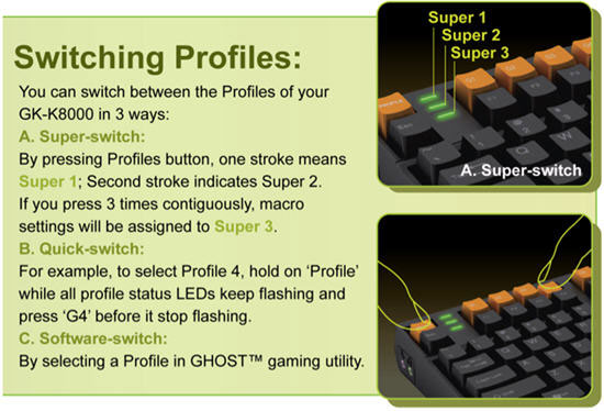Macro Editing is no longer engineers’ monopoly. By using GK-K8000, simply use the profile combination keys to make you the king of gaming world. 4Mb onboard memory allows to carry 13 presetting macro to plug and play everywhere without software driver installation.