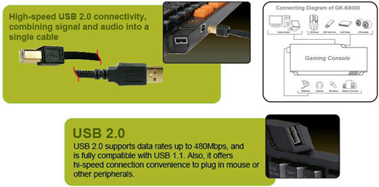 To ensure we can provide best audio quality, a Vista certified C-Media 6300 USB Digital Audio is included. Easily plug your headphone or microphone into GK-K8000 and control with onboard media control hot keys will provide you the most comfort music environment.