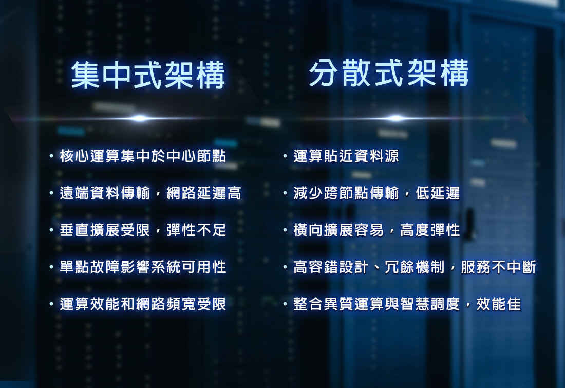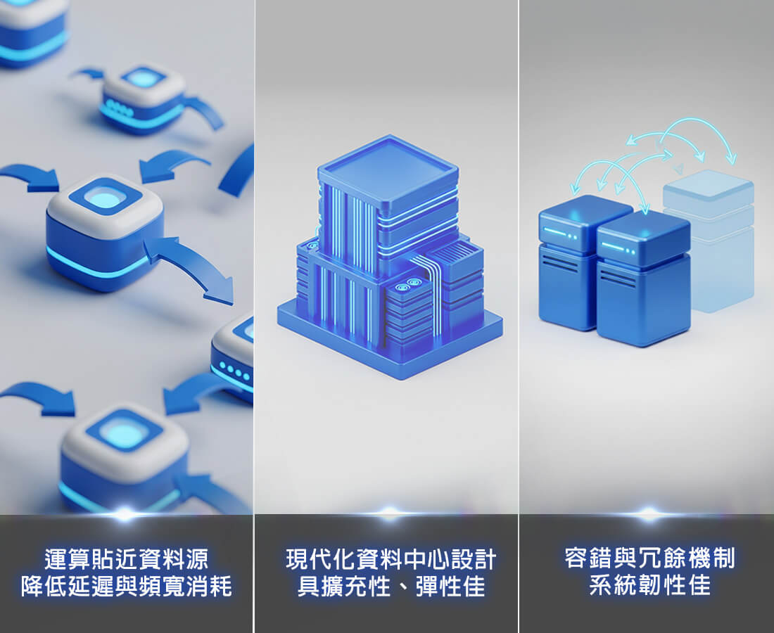 • 運算貼近資料源:將運算任務部署在靠近資料源的節點,降低傳輸延遲與頻寬消耗,支援即時分析與決策。
